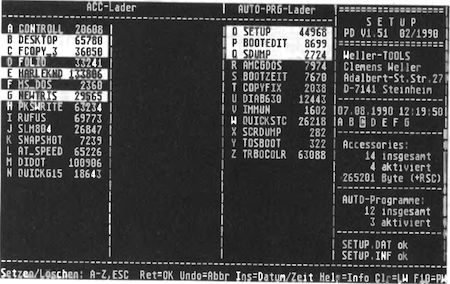 Mit »Setup« stellen Sie bei jedem Bootvorgang ein, welche Accessories und Autoboot-Programme der ST lädt. Die Auswahl erfolgt komfortabel mit den Cursortasten. Setup verwaltet bis zu 42 Accessories und 21 Autoboot-Programme. Die Hilfstexte dürfen Sie beliebig verändern, um z. B. Werbung für eigene Software einzubinden. Weiterhin befindet sich auf der Diskette ein Multifunktions-Accessory von Henrik Alt. Für Festplattenbesitzer lohnt sich die Anschaffung der PD-Programme in jedem Fall.