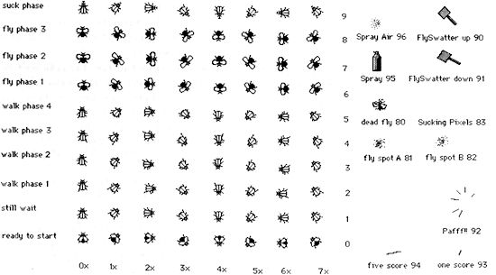 Haben Sie sich schon einmal überlegt, wie eine Fliege läuft? Nun, die Fliege schiebt zunächst ihren Körper nach vorne und zieht anschließend alle ihre sechs Beine hintereinander nach. Das hört sich leicht an. Aber es dauerte ziemlich lange, bis sämtliche Sprites für die Fliegenanimation gezeichnet waren. Eine Laufsequenz der Fliege besteht aus vier Sprites, die Flugsequenz aus drei Sprites. Für's Sitzen, Saugen und Putzen gibt es jeweils ein Sprite, was für jede Richtung zehn Sprites macht. Diese zehn Sprites müssen wir für alle acht Orientierungen definieren, womit wir für die Fliegenanimation insgesamt zehn mal acht, also 80 Sprites benötigen (siehe Bild).