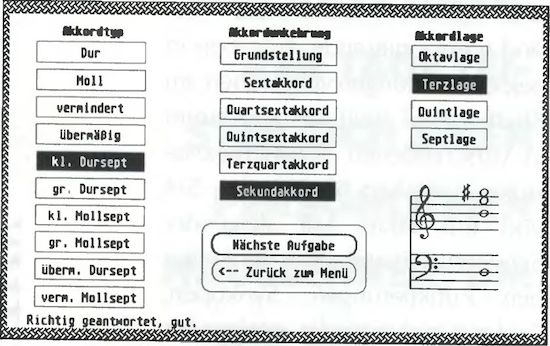 Bild 1. Ohne GEM kommt der »Computerkolleg Musik« aus. Hier eine Übungsseite zum Bestimmen der erklingenden Akkorde