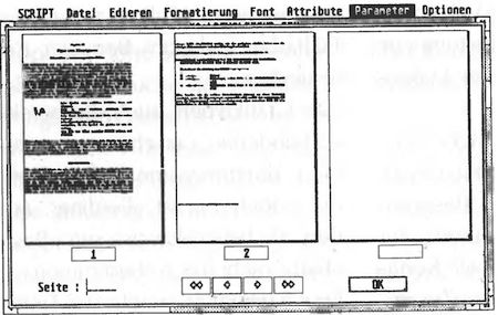 Schrifttype wie der Text möglich. Das Schreiben auf der Höhe eines Bildes ist deutlich langsamer als außerhalb eines Bildbereichs, aber die »Echtzeit«-Bildbeschriftung wiegt diese Verzögerung voll auf, zumal sie wirklich nur in den Zeilen auftritt, in denen das Bild liegt. Eine Reihe weiterer Erweiterungen und Verbesserungen sind in Script II vorhanden. Dazu gehört die Funktion »Seitenvorschau«, die genau das macht, was sie sagt. Sie liefert einen Überblick über gleichzeitig drei Seiten. Der Kontrolldruck für die korrekte Plazierung entfällt damit in Zukunft. Für Vielschreiber ist die Statistikfunktion in der Infobox eine nützliche Sache. Wer zeilengenau arbeiten muß, freut sich ebenfalls über diese Angaben. Ein Vorschlag für nächste Updates: Vielleicht sollte ASH jedem Dokument noch einen kurzen Ergänzungstext spendieren, der einige Angaben über den Inhalt des Dokuments, den Autor und das letzte Bearbeitungsdatum aufnimmt. Als besonders hilfreich für den Umgang mit Tabellen empfinde ich die Hilfslinien beim Setzen der Tabulatoren. Ein Dankeschön an die Programmierer, hier, aber nicht nur hier, haben Sie an uns arme Anwender gedacht. Sparsam ist auch die geänderte ASCII-Speicherfunktion.