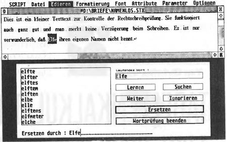 Die Wortprüfung erkennt nur Vorhände Einträge als richtig an und verfügt nicht über grammatikalische Kenntnisse. »Wörterbuch« und »Wörterbücher« sind für die Elfe also zwei völlig verschiedene Begriffe. Um keine falsche Erwartung zu wecken, sei auch gleich gesagt, daß Elfe kein erweiterter Trennalgorithmus ist. Auch in Script II bleibt es bei der Trennung von Hand.