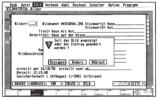 In der Version 3.1 existiert nun ein neuer Datentyp, den Sie in die Datensatzmaske integrieren können: »Bild«. Dabei steht ein Feld von zwölf Zeichen Länge zur Verfügung, um den Dateinamen der externen Bild-Dateien einzutragen. Ruft man die Maske im Ausgabemodul »EXEC« auf, erscheint ein Kästchen mit der Bezeichnung »BILD«. Beim Anklicken lädt Adimens ST Plus die unter dem entsprechenden Dateinamen abgelegte Bild-Datei und stellt sie auf dem Bildschirm dar. Selbstverständlich läßt sich die definierte Bild-Datei jederzeit ändern. Im Eingabe- und im Ändern-Modus erscheint beim Anklicken von BILD eine Dateiauswahlbox zum Auswählen einer anderen Bild-Datei. Das entsprechende Bild erscheint auf dem Monitor, und durch einen erneuten Klick auf das BILD-Kästchen trägt Adimens das neue Bild in den aktuellen Datensatz ein. Durch die Vereinbarung eindeutiger Schlüssel unterbleibt übrigens eine unerwünschte Mehrfachverwendung.