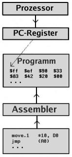 **Bild 1. Zunächst übersetzt der Assembler (und ggf. der Linker) den Duelltext in ein fertiges Programm. Der Prozessor führt die Maschinenbefehle des Programms über den PC (Program Counter) aus. **Um ein Register oder eine Adresse auf einen bestimmten Wert hin zu überprüfen, kennt der Prozessor den Befehl »cmp«. Er vergleicht die beiden Operanden miteinander. Das Ergebnis legt er im Statusregister ab. Dieses spezielle Register ist in zwei Teile untergliedert, das Systembyte und das CCR (Condition Code Register, zu deutsch Zustandscode-Register). Das Systembyte interessiert uns an dieser Stelle noch nicht; der Vergleich verändert lediglich das CCR (Bild 3). Das CCR besteht aus fünf Bit-Flags, die als Extension-, Negativ-, Zero-, Overflow- und Carry-Flag bezeichnet sind.