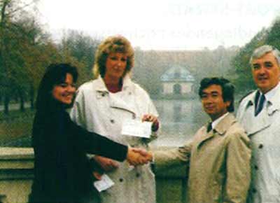 Fujitsu Deutschland-Vizepräsident Y. Suzuki (2. v. r.) und PR-Manager R. Kratz bei der Spendenübergabe an das SOS-Kinderdorf München