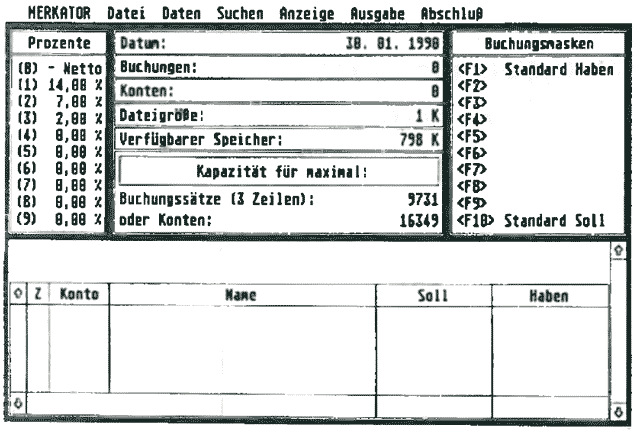 Nach dem Prinzip der doppelten Buchführung arbeitet »Merkator ST Fibu« von Marcus Daniel Cremer. Haupt-I sächlich zur Finanzbuchführung gedacht, verwaltet das mandantenfähige Programm auch sämtliche Nebenbücher. Pro Abrechnungsperiode dürfen Sie maximal 9999 Buchungssätze eingeben. Nur der verfügbare Speieher begrenzt die Datenkapazität. Das 126 Seiten starke Handbuch enthält den Industriekontenrahmen (IKR). Merkator ST Fibu benötigt mindestens 1 MByte RAM, läuft nur in der hohen Auflösung und kostet 298 Mark, eine Demoversion ist für 20 Mark erhältlich.