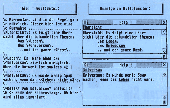 Der Hilfetext muß aber eine Erklärung zum Schlüsselwort »Übersicht« enthalten. Das Programm sucht diese Erklärung als erstes und nützt sie als Einstiegspunkt für alle anderen Erklärungen. Von hier aus verzweigt »Help« zu allen anderen Erklärungen.