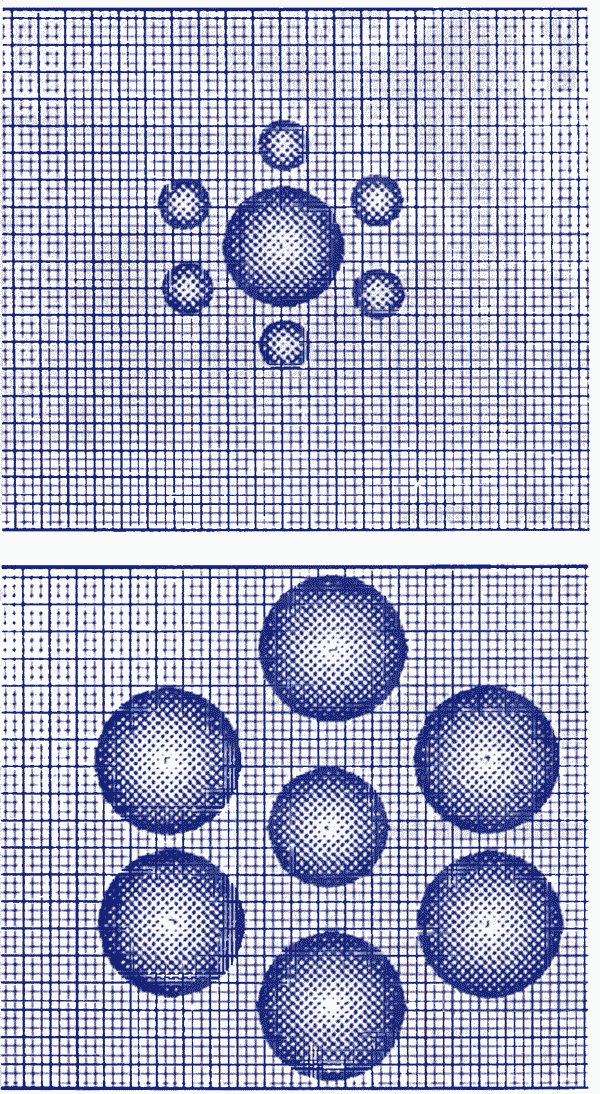 Bild 2 und 3. Hier ist ein weiteres optisches Phänomen zu sehen: Die beiden Kugeln in der Mitte sind genau gleich groß, obwohl es nicht so aussieht. Je größer ein Teilbild im Verhältnis zum Umfeld ist, desto wichtiger erscheint es im Gesamtzusammenhang. In diesem Fall vermitteln unterschiedlich große Kugeln im äußeren Ring den Eindruck, als ob die Kugel in der Mitte einmal größer und einmal kleiner ausfällt.