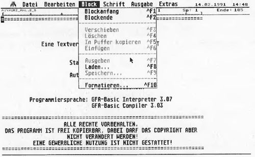 Das Blockmenü von »Minitext« erinnert an den Oldi »1st Word Plus«