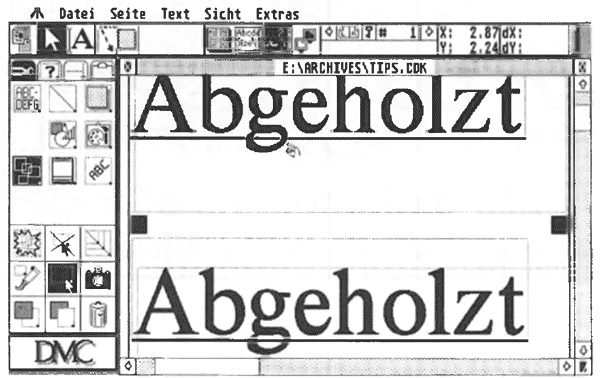 Wie bekannt besitzt »Calamus« eine eingebaute Funktion, um Texte zu unterstreichen. Leider nimmt das Programm dabei keine Rücksicht auf eventuell vorhandene Unterlängen. Abhilfe schafft das teilweise Unterstreichen mit der »Linien-Funktion«. Diese Methode ist jedoch zu arbeitsaufwendig, wenn viele Unterlängen Vorkommen, beispielsweise bei »Wolfgangs große Abneigung«. Hier gerät das Unterstreichen mit einzelnen Linien schnell zur Stundenarbeit. Besser geht es mit folgendem Trick: Man ziehe eine Linie unter den zu unterstreichenden Text. Anschließend wird der entsprechende Textbereich als Block definiert. Dann schaltet man auf »Textfarbe 0« um und klickt »umrahmt« (Outline) an. Der nächste Schritt ist ein Klick auf »Textstil umgestalten«. Jetzt fehlt nur noch die Funktion »Rahmen in den Hintergrund«, und fertig ist der druckfähig unterstrichene Text. (Martin Röse/wk)