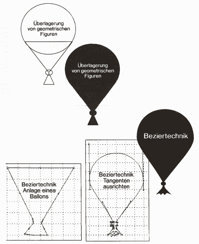 Der Luftballon wird also nicht aus vorgegebenen Flächen und Linien zusammengebastelt, sondern mit frei verformbaren Linien gestaltet. Dazu muß man den Ballon gedanklich zunächst in eine Anzahl von kleinen Teilstücken »zerlegen«. Setzen Sie dann den Anfangs- und Endpunkt einer Linie und formen sie anschließend so, daß sie den Vorstellungen entspricht. Ist der Ballon aus einer Anzahl Bezierlinien geformt, so wird er zu einem Gruppen-Objekt zusammengefaßt und steht als einzelner Rahmen für die weitere Gestaltungsarbeit zur freien Verfügung. Diese Methode ist nicht nur schneller und präziser, sondern auch bei weitem bedienungsfreundlicher als das einfache Zusammenfügen geometrischer Grundformen.