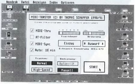 Frage 1: Nein. Einen MIDI-gesteuerten Toaster von Thomas Schöpfer gibt es nicht. Den Toaster haben wir in unserer Redaktions-Küche zusammengebaut.