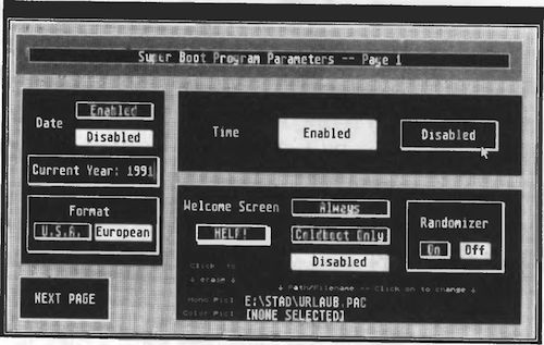 Superboot erlaubt zu Beginn des Bootvorgangs das Auswahlen bestimmter Accessories und Autoboot-Programme. Dazu kopieren Sie das Programm als erste Datei in den Auto-Ordner. Vor dem ersten Druck auf den Reset-Taster hat der Autor ein umfangreiches Installationsprogramm gesetzt, dessen Bedienung allerdings leicht verständlich und komfortabel mit der Maus vonstatten geht. Die Anleitung erklärt jeden Schritt ausführlich. Auf Wunsch meldet sich Superboot nach dem ersten Aufruf mit einem frei bestimmbaren Bild im Degas-Format. Anschließend erscheint eine Liste der verfügbaren Accessories und Autoboot-Programme.