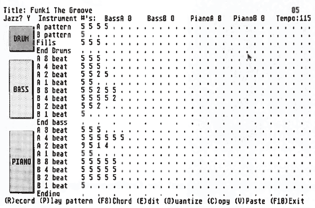 Die Bass- und Piano-Motive müssen auf der Grundlage eines C7 Akkordes erfolgen, alle anderen Harmonien erzeugt der Computer eigenständig. Unverständlich ist, daß die Aufnahme eines Pattern grundsätzlich im 4/4 Takt erfolgt. Soll eine andere Taktart Verwendung finden, stellen Sie diese anschließend im Song-Menü ein. Dieses Verfahren funktioniert zwar in der Praxis, ist aber musikalisch unsinnig.
