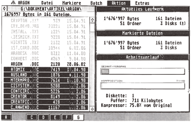 Damit das Sicherheitsbedürfnis Ihren Kontostand nicht durch übermäßigen Diskettenkauf belastet, verfügt Argon über einen Datenkompressor. Der packt die Dateien vor dem Speichern, was auf Kosten der Zeit geht. Dafür spart man durchschnittlich 30 bis 40 Prozent an Platz. Auf Wunsch formatiert das Programm Ihre Disketten auch gleich, und zwar recht flott. Elf Sektoren und bis zu 84 Tracks unterstützt Argon dabei.