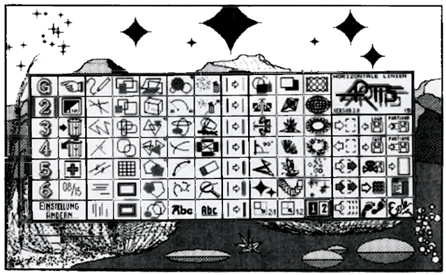 Die Auswahl der Funktionen unterstreicht den Anspruch von Artis, künstlerische Ambitionen zu befriedigen. Pinsel, Tuschefeder, Grauverläufe, Sterne, Blasen, diverse Netz- und Strahlenfunktionen liefern sofort erstaunliche Zeichenergebnisse. Auch die Verfremdungen durch die Blockoperationen können sich sehen lassen: Solarisation, Verdickung und Verdünnung in diversen Variationen. Leider sind viele Werkzeug noch zu starr. So gibt es den Grauverlauf immer in der gleichen Stärke und nur von oben nach unten oder umgekehrt. Der Pinsel kleckst in zwei relativ dicken Stärken, und die Sprühdose kennt nur drei Stärken und kein Sprühen mit verschiedenen Mustern. Auch die Lupe erlaubt nur das Setzen oder Löschen von Pixeln, zum Ändern des Lupenausschnitts muß man immer wieder in das Hauptbild zurück. Schade auch, daß die Zeichenfunktionen im Großbild nicht über die Bildschirmgrenze hinausragen. Ähnlich inkonsequent kommt die Druckfunktion. Positives zum Abschluß. Artis bietet Platz für acht externe Module, die weitere Funktionen übernehmen. Die Module »Stundenplan« und »Interferenzer« gehören zum Lieferumfang, die Module »Scanner«, »Rahmen«, »Elektro« sowie »Pro« zum Programmieren von Effekten sind zusätzlich lieferbar. Ein Wort verdient auch der im Handbuch enthaltene »Grafik-Kurs«, eine Anleitung zum praktischen Zeichnen anhand von vielen Beispielbildern. Wer diesen Kurs gelesen hat, holt aus seinem Programm mit Sicherheit eine ganze Menge guter Ergebnisse heraus.