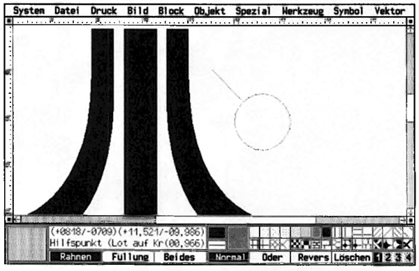 Ist die Funktion »Duplikat« aktiv, erzeugt Megapaint von allen angewählten Objekten vorder Bearbeitung automatisch eine Kopie. Am Fadenkreuz erscheint dann jeweils ein kleines Pluszeichen, das diesen Zustand kennzeichnet. Zum Setzen von Hilfspunkten - sie dienen lediglich der Orientierung und erscheinen nicht auf dem Ausdruck - gibt es ebenfalls Neues zu berichten. So können Sie ein Lot auf einen Kreis fällen und den Lotfußpunkt als Hilfspunkt setzen lassen. Das funktioniert auch mit den Schnittpunkten zweier Kreise beziehungsweise eines Kreises und einer Geraden. Ungeschickt fällt die Funktion aus, die zwei Tangenten an einen Kreis legt: Beim Konstruieren zeigt Megapaint die voraussichtlichen Schnittpunkte nicht an. Da bedarf es schon einer gehörigen Portion Augenmaß, um das Ergebnis richtig vorherzusehen. Leider ist es auch immer noch nicht möglich, einzelne Hilfspunkte zu löschen. Bisher gilt »alles oder nichts«. Es ist nur eine selektierte Anzeige der Punkte vorgesehen. Bestehende Objekte dürfen Sie beim Legen der Punkte auch nicht verwenden.