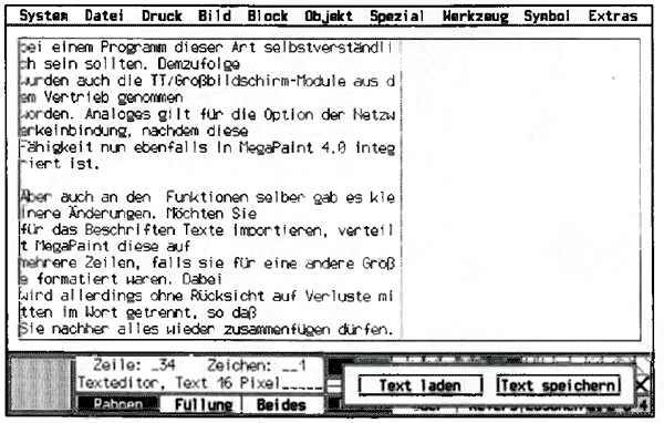 An den Funktionen gibt es kleinere Änderungen. Möchten Sie für das Beschriften Texte importieren, verteilt Megapaint diese auf mehrere Zeilen, falls sie für eine andere Größe formatiert waren. Dabei trennt das Programm allerdings ohne Rücksicht auf Verluste mitten im Wort, so daß Sie nachher alles wieder zusammenfügen dürfen. Dabei ist natürlich ein neuer Textumbruch fällig, und den müssen Sie immer noch per Hand ausführen. Hier hat man nicht weit genug gedacht, zumal beim Editieren im Texteditor immer maf wieder Zeichen verschwinden.