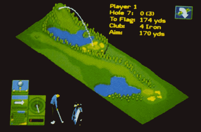 Auf sechs verschiedenen Schauplätzen darf sich der angehende Bernhard Langer die Bälle um die Ohren schmettern. Für den richtigen Einstieg in den Sport der »oberen Zehntausend« liefert das Training die ersten Erfahrungen. Dort läßt sich die Reichweite eines Schlägers gut erproben, und auch das Einlochen will gelernt sein. Jeder Spieler darf sein Profil mit den Trainingsergebnissen auf Diskette verewigen. Auf seinem Weg durch die Lüfte verfolgen Kameras den Ball bis zum Stillstand auf dem Boden. Fühlen Sie sich für den Wettkampf gerüstet, spielen Sie wahlweise gegen bis zu drei Gegner oder den Computer. Dazu haben Sie die Auswahl zwischen mehreren Turniervarianten.