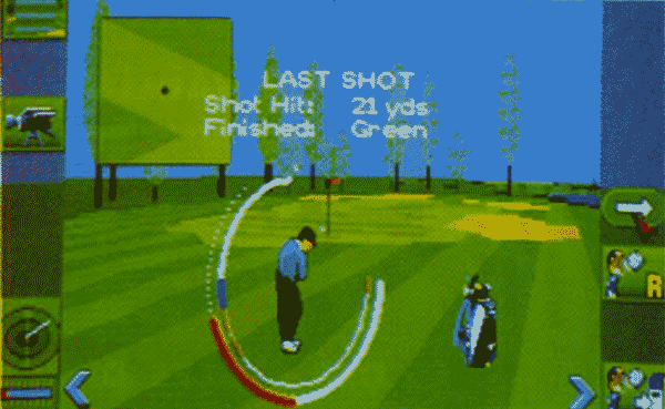 Die Simulation beachtet viele Details. Angefangen bei der Fußstellung und der Positionierung des Golfballs auf dem Boden wirken sich auch die Ausführung des Schlages sowie die Windrichtung auf die Reichweite aus. Trotz der zahlreichen Einstellungen bleibt das Spiel dank der durchdachten Menüführung übersichtlich. Solange Sie das »Grün« nicht erreicht haben, zeigt das Programm vor jedem Schlag eine Übersichtskarte mit Ihrer aktuellen Position, der Schlagrichtung und der Entfernung zum Loch. Bei der Wahl des Golfschlägers unterstützt Sie der Computer. Haben Sie Ihre im Training erzielten Ergebnisse gespeichert, sind diese jetzt sehr hilfreich. Das nächste Bild zeigt die nähere Umgebung aus der Sicht des Spielers. Eine Fahne am oberen Bildrand dient als Zielorientierung. Beim Schlag helfen zwei Halbkreise, um die Schlagstärke und die Feinabstimmung der Schlagrichtung zu bestimmen. Das notwendige Timing lernen Sie am besten im Training. Haben Sie das Grün erreicht, zeichnet der Computer ein Raster über den Boden, so daß Sie Steigungen oder Gefälle besser einschätzen können. Ein sich füllender Balken zeigt die Schlagstärke an. Das Einlochen bildet den schwierigsten Teil. Gefühl und Augenmaß sind hier gefragt.