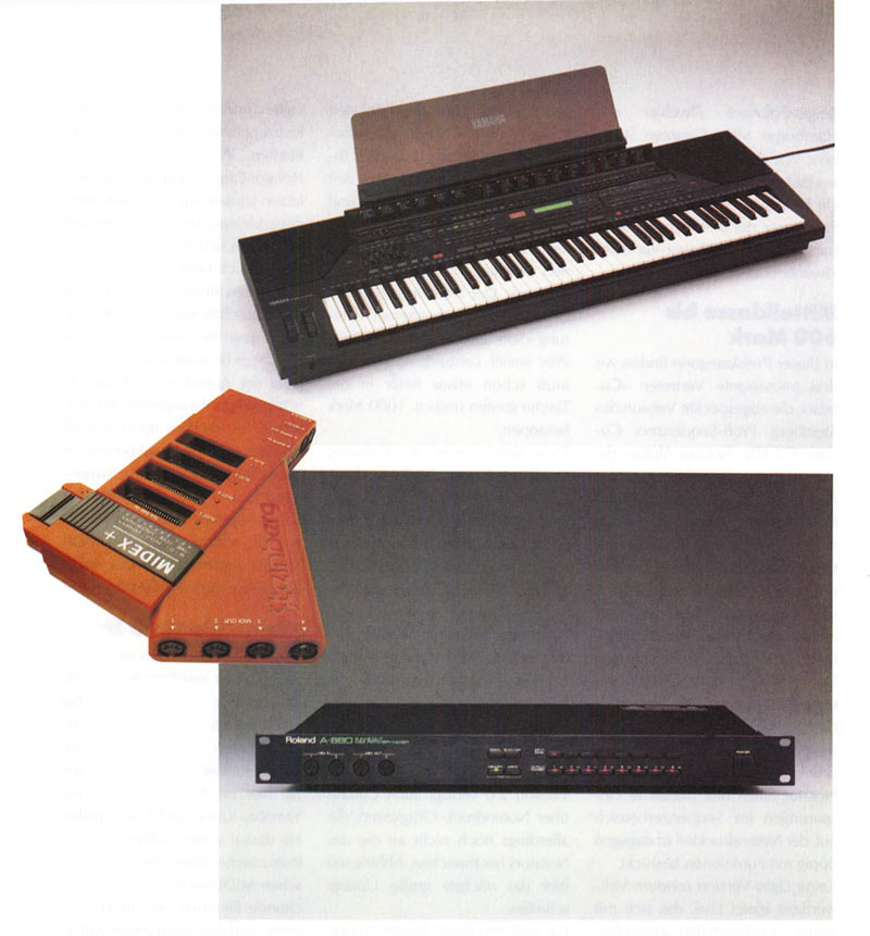 Die Preise über 2000 Mark steigen dann sehr schnell bis zur 5000-Mark-Grenze an. Instrumente in diesen Regionen sind immer luxuriöser ausgestattet, bieten immer mehr ROM-Kapazität für naturgetreue Samples und sind in der Regel wesentlich komplexer in der Bedienung und Programmierung als ihre günstigeren Kollegen. Viele dieser Synthesizer oder Sampler tragen den wohlklingenden Beinamen »Workstation«. Solche Instrumente haben zusätzlich einen üppigen internen Sequenzer, diverse eingebaute Effektfunktionen, Diskettenlaufwerk und allerlei andere mehr oder weniger nützliche Funktionen. Highlights sind beispielsweise Roland JD 800 (4600 Mark) und D-70 (4000 Mark), Yamaha SY 77 (4500 Mark), Korg M1 (3000 Mark) und Wavestation (3000 Mark). So, und nach dieser Übersicht geht es jetzt weiter mit einigen, unserer Ansicht nach besonders gelungenen MIDI-Kombinationen, passend für jede Brieftasche.