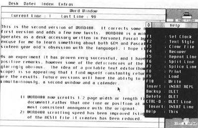Wie erwartet enthalten die Datenträger eine bunte Mischung von Programmen aller Art. Nach den am meisten benutzten Programmen gefragt, nennen frischgebackene Computerbesitzer fast immer Mal- und Schreibprogramme. Diesem Umstand tragen die Textverarbeitung »Minitext« und der als Accessory ständig verfügbare Editor »Word400« Rechnung. Letzteres gefällt durch die konsequente Fenstertechnik. Die Schreibfläche und die Hilfeseite sind in zwei getrennten Fenstern untergebracht. Das voll tastaturgesteuerte Programm scrollt zwar etwas langsam, ist aber für Einsteiger durchaus zu empfehlen.