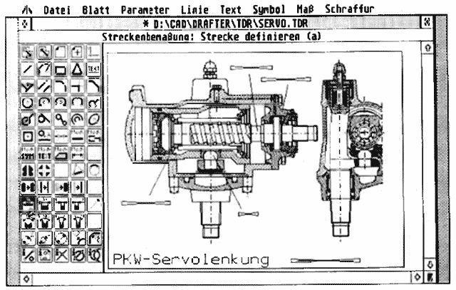 Das Programm Drafter der Firma Technobox ist schon vom Konzept her ein CAD-Programm, das sich zum schnellen und übersichtlichen Zeichnen eignet. Der Leistungsumfang fällt daher etwas bescheidener als bei dem weiter unten beschriebenen CAD/2 aus dem gleichen Hause aus. Mit dem Drafter lassen sich CAD-Zeichnungen in hervorragender Qualität bei guter Effektivität erzielen. Die Übersicht ist gegeben. Dem Anfänger stehen zu jedem Icon Hilfstexte zur Verfügung, so daß auch der unregelmäßige Umgang mit diesem Programm nicht lange aufhält. Bemerkenswert ist die Farbdarstellung und die Großbildschirm-Fähigkeit. TT-Anwender kommen ebenfalls auf ihre Kosten, und auch den Betrieb des Cache-Speichers nimmt das Programm nicht übel. Der Drafter dürfte für die meisten Standard-CAD-Anwendungen vollauf genügen und ist für mich in der mittleren Atari-CAD-Liga das Programm mit dem besten Preis-Leistungsverhältnis.
