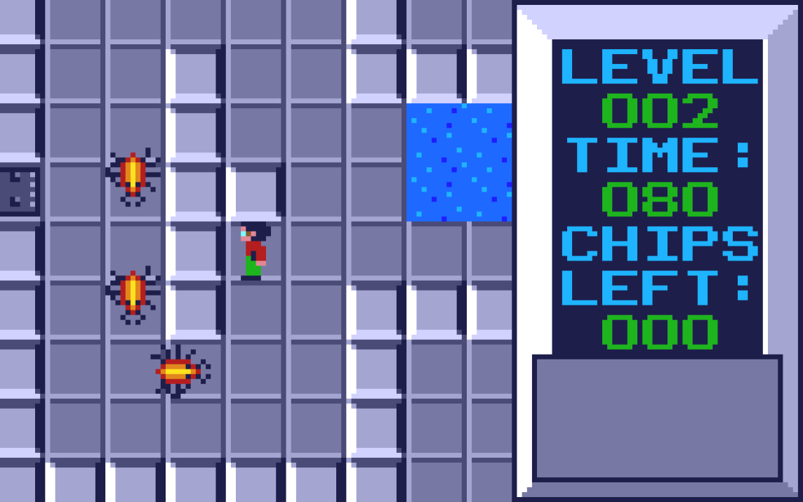 Ihre Spielfigur muß pro Stufe eine bestimmte Anzahl von Chips einsammeln. Erst mit den passenden Schlüsseln lassen sich Türen öffnen, tödliche Sprites sind zu meiden und durch das Herumschubsen von Blöcken bauen Sie sich den richtigen Weg.