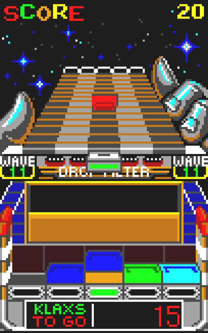 Wer schon bei den Suchtspielen »Tetris« und »Block Out« begeistert Klötzchen stapelt, freut sich über »Klax« sicher wie ein Schneekönig. Auf einem Fließband kommen bunte Spielsteine auf Sie zu. Mit einer Schippe müssen Sie die Brocken auffangen und auf einem von fünf Feldern ablegen. Mit der Zeit wird der Platz eng, denn es passen nur fünf Steine, die es in acht Farben gibt, aufeinander. Liegen mindestens drei gleichfarbige Steine neben- oder übereinander, »klaxen« diese weg. So entsteht Platz für weitere Stapelaktionen. Klax ist in mehrere Levels unterteilt, in denen Sie jeweils eine bestimmte Klax-Norm schaffen müssen, um weiter zu kommen. Zu Spielbeginn wählen Sie einen von drei Schwierigkeitsgraden. Klax ist ein exzellentes Schnelldenker-Spiel mit allen Qualitäten eines Dauerbrenners. Dieses 79 Mark teuere Spielmodul begeistert selbst Gelegenheits-Spieler.