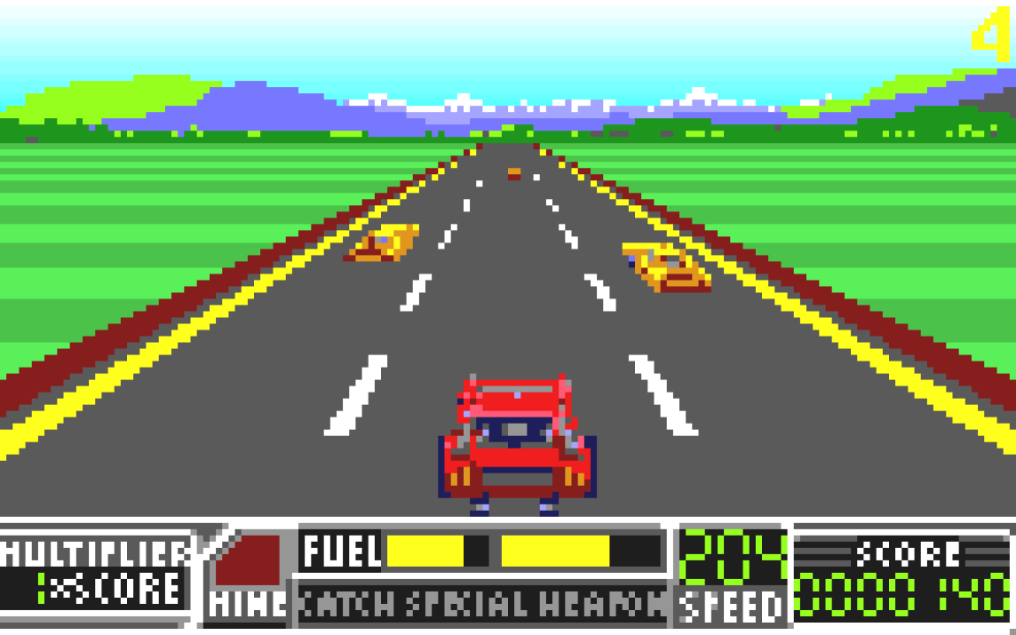 Während des Spiels müssen Sie auf gegnerische Autos und auf Ihren Tankinhalt achten. Neigt sich der Sprit dem Ende entgegen, füllen Sie ihn durch Aufsammeln von bunten Treibstoff blasen wieder auf. Wem die Bewaffnung seines Wagens nicht genügt, der rüstet sein Fahrzeug mit Zusatzwaffen wie größere Geschwindigkeit, eine Kanone oder gar mit Cruise Misseis aus. Diese Extrawaffen erhalten Sie von Zeit zu Zeit von einem Helikopter. Wer nicht blind drauflos ballert erntet mehr Punkte durch den sich erhöhenden Multiplikator. Am Etappenziel angelangt, kommt die Stunde der Abrechnung: Je mehr Punkte Sie erzielt haben, desto größere Reserven erhalten Sie.
