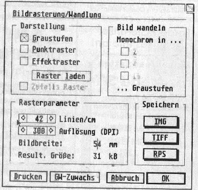 Als vom Hersteller empfohlene Mindestkonfiguration ist ein ST mit 1 MByte RAM genannt. Erfahrungsgemäß benötigt man jedoch trotz der virtuellen Bildverwaltung mindestens 4 MByte Speicher, bei der Nachbearbeitung von Grautonbildern ist eine Grafikkarte unerläßlich, da die aufgerasterte Darstellung eines Bildes ein Erkennen von Fehlem nicht zuläßt. Gute Erfahrungen haben wir mit einem TT4 gesammelt, da das Programm dessen 4-Bit-Grafikkarte unterstützt. Schon mit den dadurch vorhandenen 16 Graustufen ist eine sinnvolle Nachbearbeitung zu realisieren. Und da wir schon bei der Hardware sind: Das Programm lief im Test mit den Grafikkarten von Matrix, Maxon und Crazy Dots.