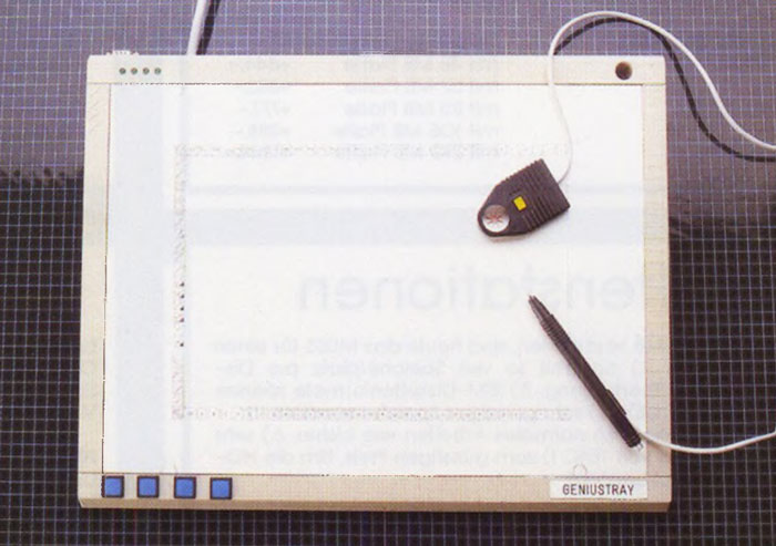 Das aus ehemaligen BestĂ€nden der mittlerweile aufgelösten Firma Robotron stammende Tablett liefert die Firma Crazy Bits serienmĂ€Ăig mit Stift und Fadenkreuzlupe. Das Tablett verbinden Sie mit der seriellen Schnittstelle des ST oder TT.