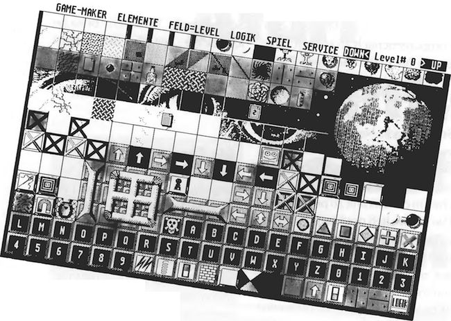 Ansätze in diese Richtung gab es auf dem ST schon mehrmals, etwa »STOS« oder die Omikron »Games Library«. Beides waren jedoch auf Spiele abgestimmte Programmiersprachen. Mit »The Game« aus dem Heim-Verlag lassen sich nun Spiele im Baukastenprinzip ohne eine Zeile Programm-Code zusammensetzen. Als Vorbild standen dabei offensichtlich die Spiele »Oxyd« und »Esprit« von Meinolf Schneider Pate: Es dreht sich nämlich alles um einen kleinen Ball, den Sie durch diverse Level steuern. Dabei müssen Sie bestimmte Steine berühren und anderen aus-weichen. Dieses Grundprinzip ist in allen mit The Game konzipierten Spielen gleich.