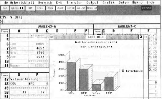 Der Einsatz bleibt natürlich nicht nur auf die rein naturwissenschaftlichen Fächer beschränkt. Geographie wird durch eine sich drehende Weltkugel und einem Abfrageprogramm nach den Hauptstädten Europas erst so richtig abwechslungsreich. Die MIDI-Fähigkeiten eines Atari ST geben dem Musikunterricht neue Würze. In Gemeinschaftskunde läßt sich eine Wahl in der Klasse nach dem d'Hondschen Verfahren und dem Verfahren nach Hare-Niemeyer auswerten. Stellt man die Ergebnisse dann noch im Balkendiagramm mit einer Tabellenkalkulation dar, kommt richtiges WahInachtfeeling auf. Ein Demoarbeitsblatt hierzu für »LDW« finden Sie ebenfalls auf der TOS-Diskette (vgl. Bild 3).