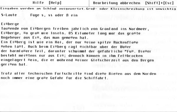 Nach dem Laden ruft man zunächst den zu bearbeitenden Text auf. Auf der Diskette finden Sie Beispiele zu: Deutsch, Englisch, Biologie, Französisch und Informatik. Dabei ist das Programm schon für Klasse 2 geeignet. Denken Sie beispielsweise an lese- und rechtschreibschwache Schüler. Von einem mehrfach geübten Diktat lassen sich Teile herausstreichen, die die Schüler wieder einsetzen müssen. In den höheren Klassen stehen dann Übungen zur Frage: Wann < s >, < ß > oder < ss > auf dem Programm.