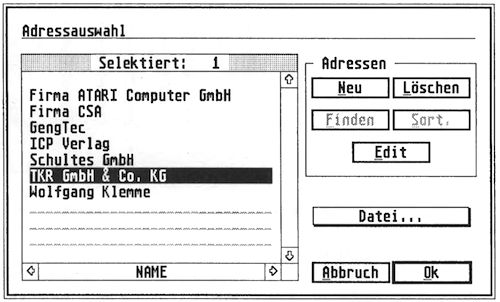 Stärken: individuell einstellbares Blattformat □ GEM Oberfläche □ Großbildfähig □ leichte Bedienung □ Modulkonzept □ eingebaute Adressverwaltung □ Ausdruck über GDOS