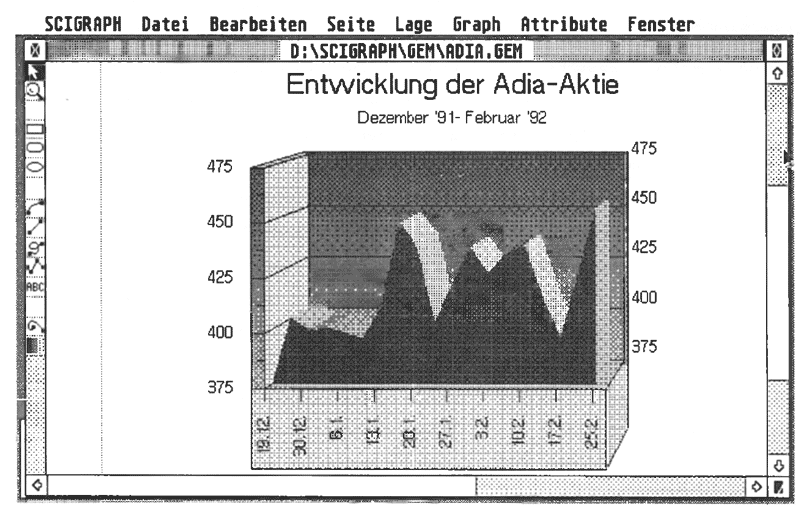 Wie aber bekommt man jetzt eine solche Farbgrafik ordentlich ausgedruckt? Zum einen können Sie das Diagramm natürlich als *.GEM-Datei speichern und es dann mit anderen Programmen weiterbearbeiten. Das funktioniert ganz normal unter Datei/Speichern -zumindest theoretisch. In der Praxis ist das Bild weniger rosig: Publishing Partner Master verschluckt beim GEM-Import einige Grafikteile sowie den Text, bei Easy-Draw versinkt das ganze Bild in einem einheitlichen schwarzen Brei, und auch Arabesque Professional färbt diverse Flächen nach eigenem Gusto um. Calamus 1.09 N weigert sich komplett, die Grafik richtig einzulesen, und bei Calamus SL wird der Text durch Ersatzfonts verstümmelt, die sich dann irgendwo im Dokument niederlassen. Besonders bei Farbverläufen wird es problematisch. Der Grund für diese Kommunikationsschwierigkeiten liegt darin, daß das GEM-Format zwar offiziell genormt und dokumentiert ist, in der Atari-Welt sich aber niemand so recht darum zu kümmern scheint und jeder sein eigenes GEM-Süppchen kocht.