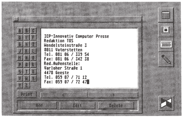 Der einfache Kalender öffnet sich beim Klick auf das entsprechende Icon. Bei korrektem Datum erscheint gleich die richtige Monatsübersicht. Das Zeichenprogramm lädt Bilder im monochromen Degas-Format. Leider können Sie immer nur etwa ein Drittel des Bildes verarbeiten. Außerdem speichert das Zeichenmodul nur den aktuellen Bildausschnitt als monochromes Degasbild. Die Fülle an Zeichenfunktionen beschränkt sich auf Rechtecke, Kreise, Polygone und Linien. Texte fügt das Programm nur im Systemzeichensatz in das Bild ein. Das Modul zur Adressenverwaltung lädt beim Start der Benutzeroberfläche eine Datei mit den Einträgen. Mit den Pfeilbuttons scrollen Sie einzelne Adressen. Links finden Sie Knöpfe mit Buchstaben, mit denen Sie direkt den jeweils ersten Eintrag wählen. Geben Sie eine neue Adresse ein, ordnet sie das Programm automatisch richtig ein. Verändern Sie eine bestehende Adresse oder fügen Sie eine hinzu, speichert das Modul beim Verlassen des Fensters die Adreßdatei.