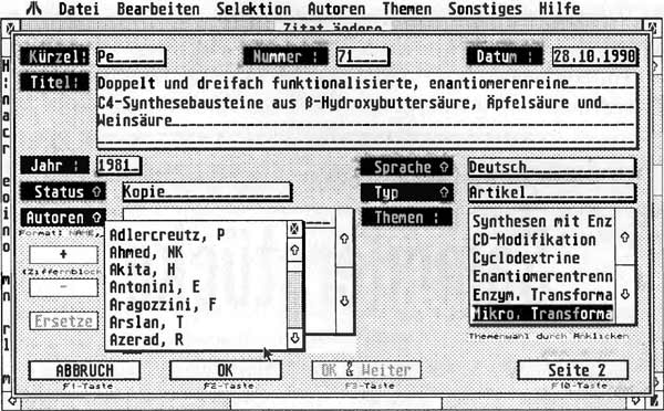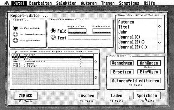 Die Suche nach den richtigen Datensätzen erfolgt sehr schnell und hält sich auch auf einem ungetuneten ST meist im Bereich von wenigen Sekunden. Hier zeigt sich der Vorteil, daß der Datenbestand komplett im Speicher steckt und kein zeitraubender Zugriff auf die Platte nötig ist. Review gibt sich beim Speicherbedarf übrigens durchaus genügsam. Selbst mit nur 1 MByte RAM kommt man noch einige hundert Dokumente weit. Eine große Stärke von Review ist der Datenaustausch. So lassen sich problemlos vorhandene Datenbanken importieren. Das Programm versteht die wichtigsten in der Wissenschaft gebräuchlichen Formate. Sollte man dennoch einmal mit einem Exoten konfrontiert werden, ist es kein Problem, sich die entsprechende Formatierungsdatei selbst anzulegen. Review hilft hier mit einem komfortablen Editor. Genauso flexibel zeigt sich das Programm auch beim Export.