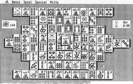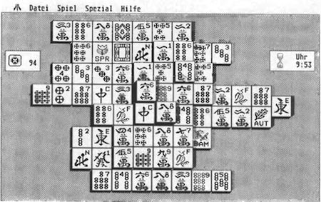 »Premium Mah Jongg« ist eine grafisch hervorragende Umsetzung dieser faszinierenden Spielidee. Die beiden Autoren, Jens Schulz und Thomas Grube, legten sichtlich Wert auf eine optimale Gestaltung des Programms. Im Gegensatz zu vielen anderen Umsetzungen entsprechen die Spielsteine von Premium Mah Jongg wirklich den Originalsteinen. Die Programmierer haben für 4 verschiedene Auflösungen, egal ob farbig oder monochrom, die Steine von Hand gezeichnet. Dadurch arbeitet Premium Mah Jongg auf praktisch allen Konfigurationen - egal, ob Sie die Mindestkonfiguration, einen STM am Fernseher, oder einen TT mit monochromen Großbildschirm benutzen. Das Programm läuft in den Grafikmodi ST-Niedrig, ST-Hoch, TT-Mittel und TT-Hoch. Mah-Jongg-Anfänger sollten erste Spielversuche in der Solitaire-Variante unternehmen. Sie haben dann beliebig viel Zeit, die Steinpyramide abzutragen. Fortgeschrittene versuchen sich wohl eher am Tournament-Modus. Dort stehen verschiedene Zeitlimits von 12 bis 4 Minuten zur Verfügung.