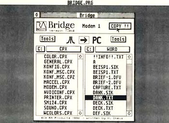 Nach der Montage verschwindet der Huckepack-Tower unter dem Schreibtisch, so daß sich dort bei vollem Ausbau nur noch eine Tastatur und zwei Monitore befinden. Mit dem auf Seite 40 vorgestellten Drucker-Netzwerk Data-Link bedienen Sie einen Drucker mit beiden Computern. Für Tower-Kunden kostet Data-Link 225 Mark. Nachdem die Platzprobleme beseitigt sind, steht der Anwender meist vor der Frage, wie er seine Dateien zwischen der TOS- und DOS-Welt überträgt. Auch hier hilft RA Computer weiter. Mit dem Programm »Bridge« und einem Serverprogramm auf dem PC übertragen Sie die Dateien schnell und sicher über die serielle Schnittstelle. Auf der Atari-Seite läuft Bridge sowohl als Programm als auch als Accessory. Damit steht einer Übertragung aus anderen GEM-Programmen nichts im Wege. Die Steuerung des Transfers erfolgt dabei mit der Maus im Programmfenster von Bridge auf dem ST.