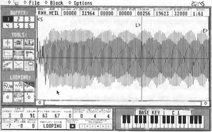 Nach seinem Start erfreut sich das Testerauge an einer angenehm aufgeräumt wirkenden Hauptseite, deren überwiegener Teil das Fenster zur grafischen Samplebearbeitung einnimmt. Links daneben finden sich fünfzehn Icons zur Sample-Nachbearbeitung sowie Buttons für die Anwahl der sechs Sample-Buffer. Ein Fenster mit den Systemparametern sowie ein kleines »Mausklavier« am unteren Bildschirmrand komplettieren den Editor.