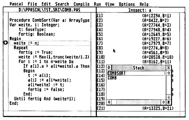 Kein Programm ohne Fehler - wichtig ist nur, daß man sie findet. Der Quelltext-Debugger von Pure Pascal eignet sich dazu sehr gut. Er erinnert sehr an den Debugger von Pure C - wen wundert's. Alle von der Entwicklungsumgebung gestarteten Programme laufen unter seiner Kontrolle ab. Man kann sie wahlweise Zeile für Zeile oder bis zu einem gesetzten Breakpoint ablaufen lassen und sich dabei etwa die Werte von bestimmten Variablen anzeigen lassen. Ein Doppelklick zusammen mit der Control-Taste auf einen anderen Variablennamen im Fenster mit dem Quelltext bringt ein Fenster mit dem Inhalt dieser Variablen zum Vorschein. Der Debugger wechselt außerdem intelligent zwischen dem Bildschirm mit der Programmausgabe und den »internen« Informationen. Auch hier läßt sich die genaue Verfahrensweise konfigurieren, um die Arbeit am Großbildschirm zu gewährleisten. Dies mag als Vorgeschmack reichen. Der Debugger hat weitaus mehr Funktionen, als man in einem Testbericht erwähnen könnte. Im Handbuch werden sie in einer auch dem Anfänger gut verständlichen Art erklärt. Prädikat: Wertvoll! Auch ST-Pascal hat einen Menüpunkt »Debugger«, der seinen Namen jedoch nicht verdient. Mit einem (nicht im Lieferumfang enthaltenen) Debugger muß man sich in die Assembler-Tiefebenen schwingen. Lediglich die im Programm verwendeten Namen übernimmt der Debugger in Form von Symbolen, um die Arbeit ein wenig zu erleichtern.