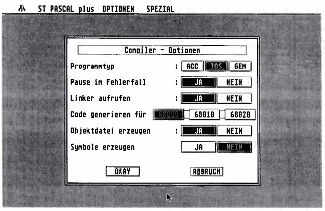 ST-Pascal baut auf eine eigene Bibliothek, die z.T. mehrere GEM-Aufrufe zusammenfaßt und für mehr Übersicht im Quelltext sorgt. Gerade dem GEM-Einsteiger erleichtert diese Tatsache die Arbeit. Hinzu kommt, daß man mit ST-Pascal Menüs und Dialoge leicht »von Hand«, also ohne ein Resource Construction Set erstellen kann. Negativ zu Buche schlägt die 1800 Zeilen lange Include-Datei, die von jedem GEM-Programm benötigt wird. Hier verlangsamt sich die Übersetzung deutlich. Man tut gut daran, sich eine eigene Version dieser Datei für den täglichen Gebrauch zusammenzustellen, die nur die Deklarationen enthält, die man tatsächlich verwendet. Die neue Version 2.10 enthält jetzt auch alle GEM-Aufrufe in ihrer Urform, so daß der Programmierer nicht mehr an den ST-Pascal eigenen Ansatz zur GEM-Programmierung gebunden ist.