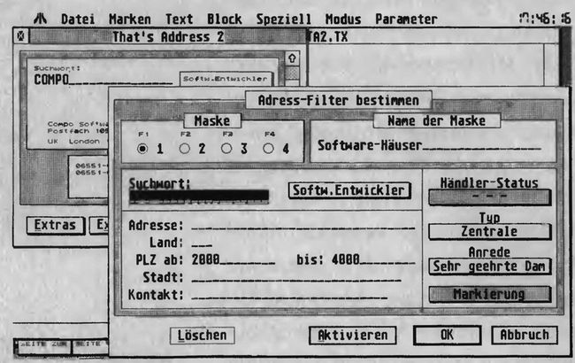 That's Address hatte bisher immer den Ruf eines Zubehörs für That's Write. Wer diese Textverarbeitung benutzt, der bleibt bei der Verwaltung seiner Adressen gleich im Hause und nimmt That's Adress, auch wenn diese Adressverwaltung nicht unbedingt das Optimum seiner Art war. Nun hat sich Compo aber offensichtlich vorgenommen, diese Einschränkungen in jeder Hinsicht zu beseitigen. Das neue That's Address 2 präsentiert sich als Software zur Adressen- und Informationsverwaltung allerbester Güte. Von der Oberfläche über die Gesamtorganisation bis zu den Detaillösungen überrollt es den Anwender mit Neuerungen. Schauen wir uns die Details genauer an. That's Address 2, kurz TA2 genannt, existiert in zwei verschiedenen Versionen, einmal als Accessory, wie bisher schon gewohnt. Außerdem gibt es aber noch eine Programm-Version. Diese Zweiteilung hängt mit folgender Überlegung zusammen. Eine Adressverwaltung muß möglichst immer im Zugriff sein, also ist die Accessory-Lösung sehr vorteilhaft. Trotzdem gibt es bei so einer Software eine Menge Funktionen und vor allem Einstellungen, die man nur selten benötigt. Um nun nicht das ständig präsente Accessory unnötig aufzublähen, gibt es die umfangreichere Programmversion, in der alle selten benötigten Funktionen untergebracht sind.