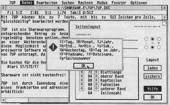 Für sein Programmpaket, das neben der eigentlichen Textverarbeitung noch einige Hilfsprogramme und eine Sammlung von Icons beinhaltet, verlangt Michael Thänitz eine Shareware-Gebühr von 50 Mark. 7UP überzeugte uns voll und ganz von der mitunter sehr hohen Leistungsfähigkeit von Shareware-Program men.