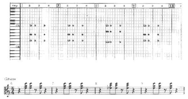 Mit einem kleinen Tip wollen wir dann unsere, zugegebenermaßen recht umfängliche, Gitarren-Sektion beenden: Sollten Sie langsam in Stimmennot geraten oder aber befürchten, daß Ihrem Klangerzeuger spätestens bei der Melodie die Puste ausgeht, sparen Sie durch Löschen der mittleren Gitarrenstimme (auf unserem Bildschirmfoto schwarz markiert) eine Stimme. Da bereits das Piano die vollständigen Harmonien spielt, fällt diese Reduktion nicht stark ins Gewicht.