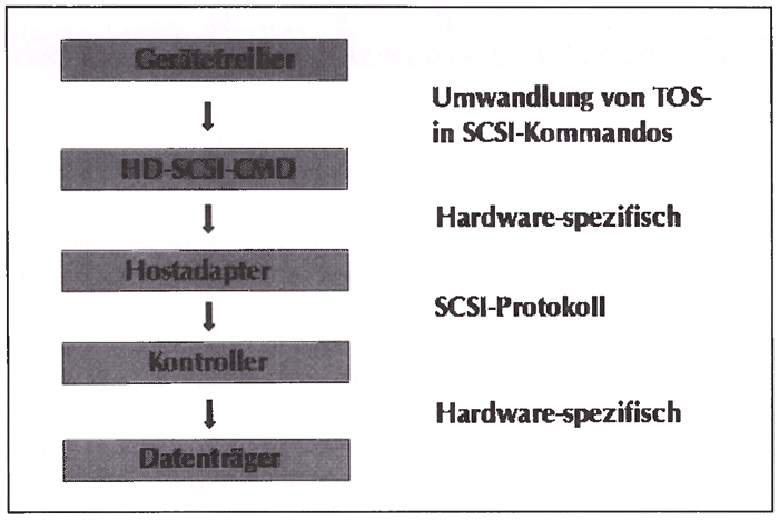 Erst der Gerätetreiber übersetzt TOS- in SCSI-Kommandos