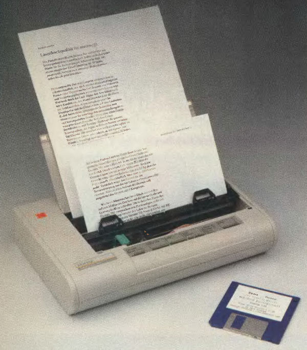 Der Diconix 701 ist ein thermogesteuerter Tintenstrahl-Drucker, der mit Normalpapier arbeitet. Das größte an ihm ist seine »Größe«, denn mit ca. 30x20x6 cm und etwa 2,5 kg paßt er in jeden Aktenkoffer. Ideal für Unterwegs, denn neben der Stromversorgung per externem Netzteil läuft der Kleine auch etwa eine dreiviertel Stunde ohne Druckpause auf Akkubetrieb. Anschluß findet das Gerät über die parallele Schnittstelle, so daß ein Betrieb mit den meisten Laptops etc. ohne Schwierigkeiten funktioniert. Wünschenswert erscheint mir jedoch zumindest wahlweise eine serielle Schnittstelle.