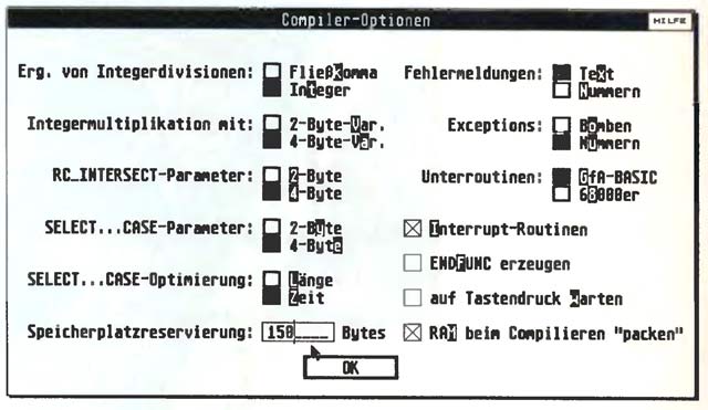 Hier unterstützt Sie das Hilfsprogramm »Defcon«, das Quelldateien der Formate * H (C-Header), *.RSD, *.DEF und *.DFN in eine ASCII-Datei konvertiert. Diese läßt sich zur RSC-Initialisierung mit dem Befehl »MERGE« in die eigenen Programme einbinden. Dieses Verfahren erleichtert das Warten und Ändern der eigenen Programme ungemein, da Sie die Objekte Ihrer Ressource nicht über die Nummern des Menübaums, sondern mit Konstanten verwalten. Die Utilities werden von »XShell« abgerundet, einem vollwertigen Ersatz der »MENUX«-Shell, die zum Lieferumfang des GFA-BASIC gehört. Mit der XShell rufen Sie den Interpreter und bei Bedarf den Compiler auf. Auch bestimmen Sie hier sehr bequem die Compiler-Einstellungen und testen nach einem Compiler- und Linker-Lauf Ihr Werk aus.