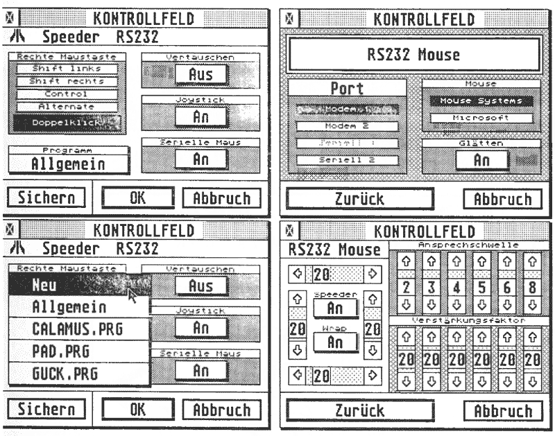 Wie schon erwähnt, ist in Wrap-Mouse auch ein Beschleuniger für unser Lieblingstier enthalten. Aufgrund der unterschiedlichen Charakteristiken kann die Art und Weise der dynamischen Beschleunigung separat für Atari-, Serielle- und Joystick-Maus eingestellt werden. Sie finden die jeweiligen Dialoge im Hauptteil unter »Speeder«.